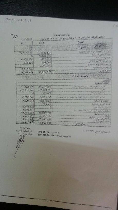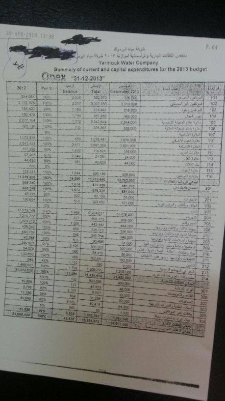 وثائق لميزانية شركة مياه اليرموك اقليم الشمال في محافظة اربد خلال العام الماضي 2013 تبين عجز فيها حوالي اربعين مليون دينار .