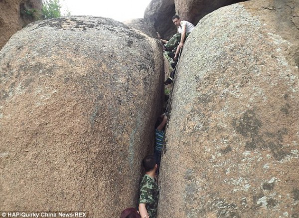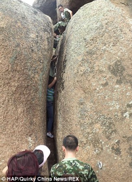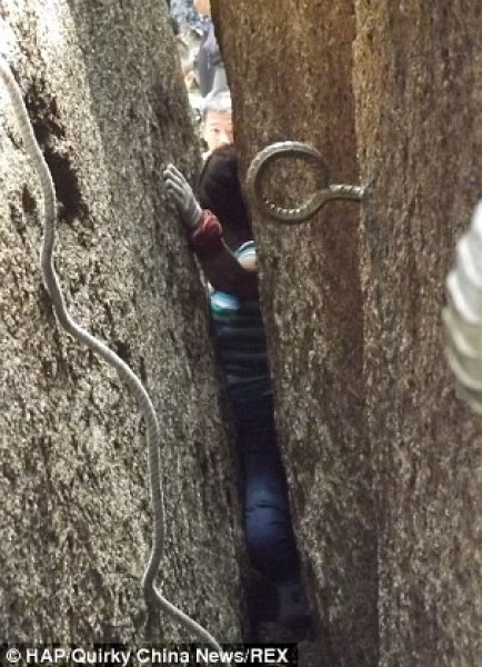 وقالت المرأة بعد ذلك أنها حاولت المشي من خلال الصخور بدافع الفضول لكن ثدييها وأردافها جعلوها تعلق في ذلك المكان.
