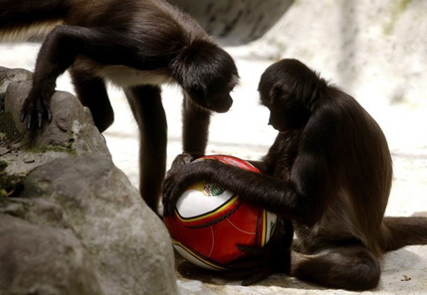 يقوم اثنان من قردة أحد حدائق الحيوان في مولومبيا الآن داخل مدينة ميدلين باللعب بكرة قدم كأس العالم التي تقام في البرازيل، والتوقع للمباريات التي ستتم في المستقبل، لاستكمال دائرة التوقعات والمراهنات التي تنتشر في هذا التوقيت.