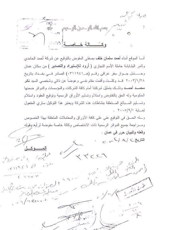 الجميلي الذي اتهمه فيما بعد انه زور توقيعه بموجب هذه الوكالة التي ننشر صورة طبق
