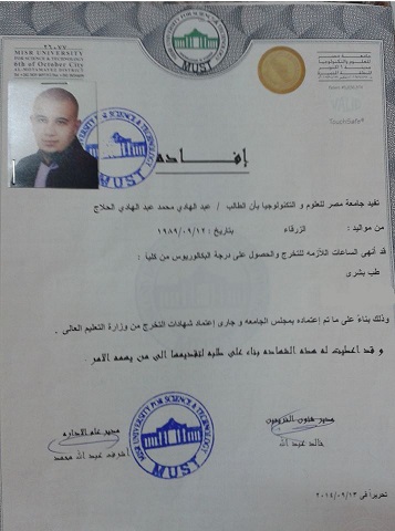 اخبار البلد : يتقدم الصحفي حسن سعيد صفيرة مدير عام وكالة اخبار البلد بأحر التبريكات ووافر التهاني من الاخ والصديق محمد الحلاج بمناسبة تخرج ولده عبدالهادي من كلية الطب البشري/جامعة مصر للعلوم والتكنولوجيا -2014