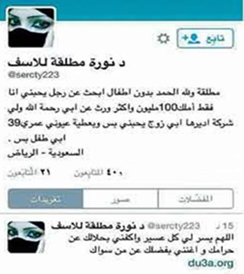 وﻗﺎﻟت اﻟﻣرأة اﻟﺗﻲ ﺳﻣت ﻧﻔﺳﮭﺎ ﺑـ ”د ﻧورة ﻣطﻠﻘﺔ ﻟﻸﺳف" ﻋﺑرﺣﺳﺎﺑﮭﺎ: ”أﻧﺎ ﻣطﻠﻘﺔ ــ و اﻟﺣﻣد الله ــﺑدون أطﻔﺎل، أﺑﺣث ﻋن رﺟل ﯾﺣﺑﻧﻲ أﻧﺎ ﻓﻘط، أﻣﻠك 100 ﻣﻠﯾون وأﻛﺛر ورﺛﺗﮭﺎ ﻋن واﻟدي ــ رﺣﻣﮫ ﷲ، وﻟﻲ ﺷرﻛﺔ أدﯾرھﺎ، أﺑﻲ زوج ﯾﺣﺑﻧﻲ ﺑس، وﺑﻌطﯾﮫ ﻋﯾوﻧﻲ،ﻋﻣري 39 ﺳﻧﺔ، أﺑﻲ طﻔل وﺑس".