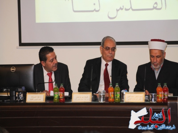 وتحدث خلال الندوة التي رعاها رئيس الجامعة الدكتور عمر الجراح، والقى مفتي الدفاع المدني العميد الدكتور محمد الغول حيث اكد على عروبة القدس التي تشكل احدى اهم الاماكن الاسلامية المقدسة ولها مكانتها العظيمة في نفوس العرب والمسلمين على وجه العموم.