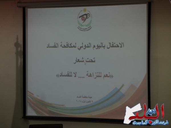 احتفلت هيئة مكافحة الفساد صباح اليوم الثلاثاء باليوم الدولي لمكافحة الفساد حمل شعار " نعم للنزاهة .. لا للفساد " ,والذي تحيي فعالياته معظم دول العالم الموقعة على الاتفاقية الدولية لمكافحة الفساد, حضره عدد من المعالي والعطوفة والنواب وكبار رجالات الدولة ومهتمين اعلامين ومراقيبين.