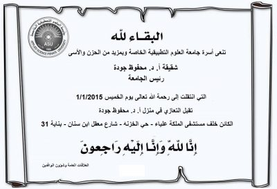 تنعى اسرة جامعة العلوم التطبيقية الخاصة وبمزيد من الحزن والأسى شقيقة أ. د. محفوظ جودة رئيس الجامعة