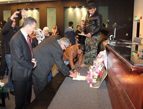 حيت ألقى الأستاذ الدكتور عمر الجراح رئيس الجامعة كلمة بدأ فيها بتقديم أصدق مشاعر المواساة والعزاء لسيد البلاد والشعب الأردني وآل الكساسبة الكرام وأن يلهم أهله وذويه الصبر والسلوان .وأضاف أن مثل هذه الجماعات والفئات الضالة هي بعيدة كل البعد عن ديننا الإسلامي الحنيف وتعارض كافة الشرائع وأن هذا المصاب الجلل ما زادنا إلا قوة ووحدة وعزماً واصراراً والتفافاً حول القيادة الهاشمية بقيادة سيدنا عبد الله الثاني ابن الحسين .