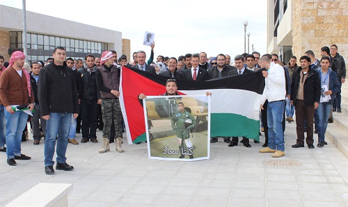 وعبر طلبة الجامعة بكلمات وقصائد شعرية عن بالغ أسفهم وحزنهم إزاء استشهاد النقيب الطيار الكساسبة الذي قدم روحه الطاهرة فداء للوطن والأمة والإنسانية جمعاء على أيدي هذا التنظيم ما يؤكد وحشيته لأبسط القيم الإنسانية.
