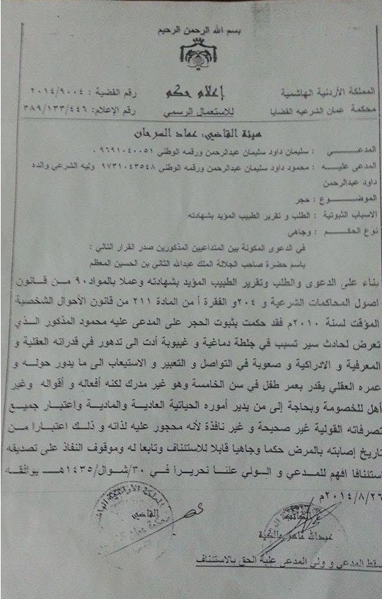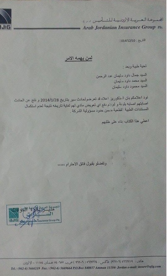 في بداية العام الماضي 1/2014 تعرض ثلاثة من ابناء الحاج داوود الافغاني (محمود وجمال ومحمد) الى حادث اليم لم يكونوا المتسببين فيه عندما التف نحوهم باص لنقل المعتمرين مخالفا المسرب ومسرعا في شارع جامعة الزرقاء الخاصة ليرتطم بهم بقوة ويحطم السقف والابواب عليهم مخلفا وراؤه صرخات شباب نالهم من الاذى ما لا يوصف- بحسب التقارير الطبية التي حصلت عليها اخبار البلد.. وتم نقلهم الى مستشفى الزرقاء الحكومي المكتظ فلم يأبه الاطباء كثيرا واكتفوا بمعاينة حالة الاخ الاكبر الذي تسبب الحادث بخروجه من السيارة..!