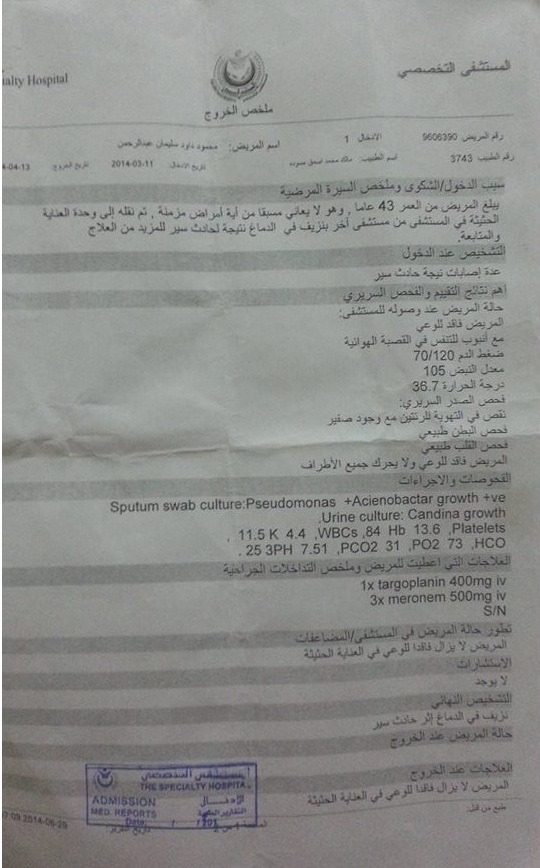 ولغاية كتابة هذا التقرير محمود لا يزال في غيبوبة كامل واكد تقرير طبي بان محمود حتى لو عاش فقد يعيش بعمر طفل ( 5 سنين ) لا حول ولا قوة الا بالله .