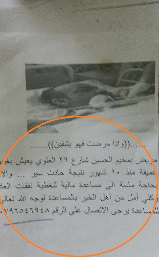وقال والدموع تذرف خجلاً انني قد لجأت لإرسال أطفال أشقائي للتسول امام مسجد الكالوتي حيث طبعت منشور من خلاله يتسولون ليجدوا ولو لقمة عيش لان مصاريف المستشفيات والادوية أصبحت عبأ على الاسرة ليفروا قوتهم اليومي .. المنشور مرفق مع التقرير