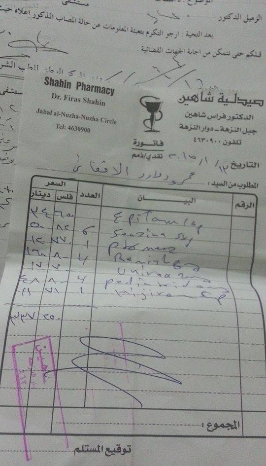 وذكر سليمان ان تكاليف العلاج باتت باهظة حيث يدفعون مبلغ الف دينار اسبوعيا لعلاج محمود وقد تم دفع مبلغ 90 الف دينار حتى هذه اللحظة لعلاجه ساهم فيها اهل الخير والمتبرعين واضاف بان محمد وجمال بحاجة لعمليات جراحية تقدر بآلاف الدنانير.. كما ان محمود بحاجة الى دواء غير متوفرة بالصدليات ولا بديل لها وقد شارفت على الانتهاء .