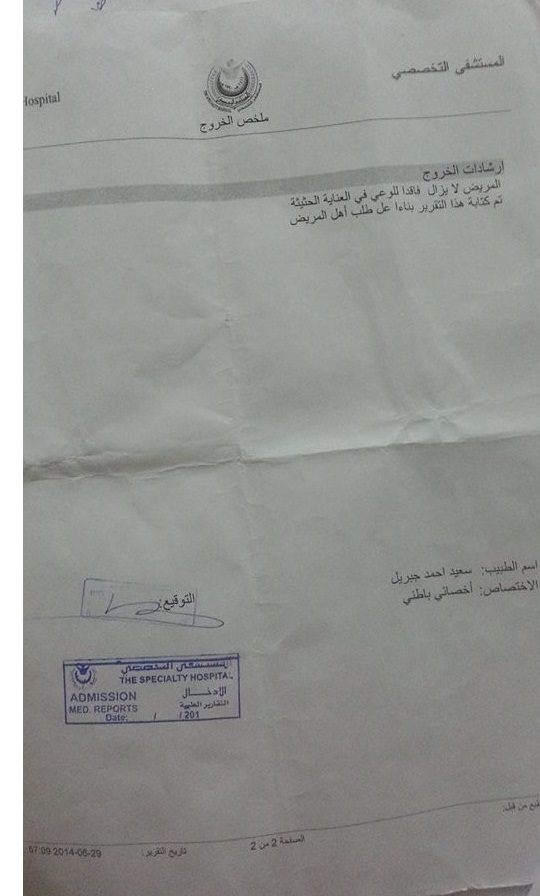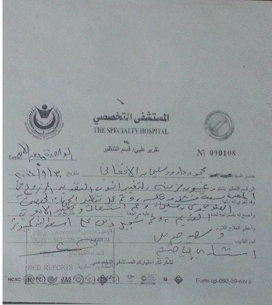 نزيف حاد على الدماغ – تحرك الدماغ من مكانه – تجلطات وضمور على الدماغ – تجويف في قاع الدماغ – وكسر بالفك السلفي مع نزيف وقد اجرى له عملية ترميم بمستشفى جبل الزيتون بالاضافة الى انه اصيب بنزيف بالرئتين وكسر بريش القفص الصدري مما ادى الى حدوث نزيف بالرئتين وقد تم ايقاف التنفس الطبيعي له لحين اندمال الكسور واستبدالها بالتنفس الاصطناعي .