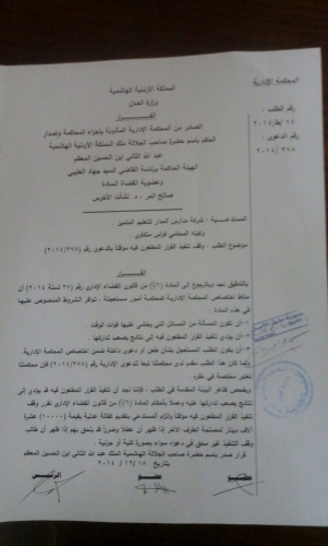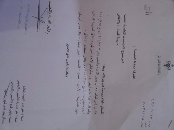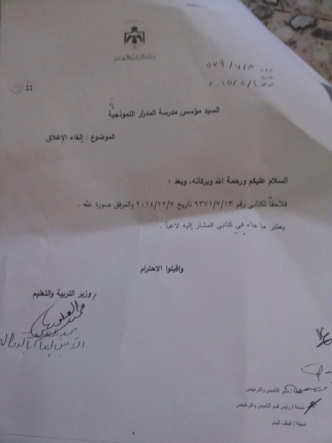 وبعد صدور قرار وقف الاجراء تم تبليغ وزير التربية والتعليم وأمين عام الوزارة بموجب كتاب خطي، وذلك بتاريخ الرابع من الشهر الجاري، الامر الذي صدر بموجبه سحب قرار الاغلاق حسب امر المحكمة ... الا ان مدير ادارة التعليم الخاص "فريد الخطيب" في وزارة التربية لم يمتثل لامر المحكمة ولا لقرار الوزير في الغاء الاغلاق فوجه كتاب اخر يفيد باغلاق المدرسة التي تظم اكثر من الفين طالب