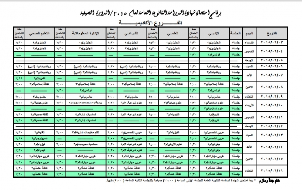 وقال الناطق الإعلامي باسم الوزارة وليد الجلاد، انّ الامتحانات وفق البرنامج الأولي ستبدأ في 3 / 6 / 2015 وتنتهي في 16 / 6 /2015، مشيراَ إلى ان الجلسة الأولى من الامتحان ستبدأ الساعة الحادية عشرة صباحا، فيما تبدأ الجلسة الثانية في تمام الساعة الثانية بعد الظهر.