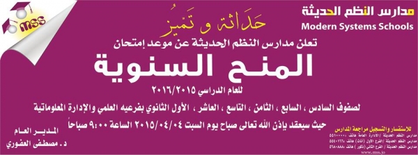 اعلنت مدارس النظم الحديثة عن موعد لامتحان المنح الدراسية السنوية للعام 2015 /2016 للصفوف التالية