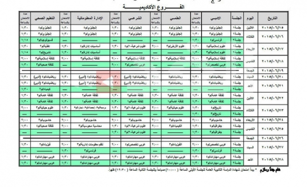 وبين الناطق الإعلامي باسم الوزارة وليد الجلاد ، أنّ برنامج امتحان شهادة الدراسة الثانوية ، سيبدأ في 15 حزيران (يوليو) المقبل وينتهي في 28 حزيران (يوليو) المقبل، مشيراَ إلى أن الجلسة الأولى من الامتحان ستبدأ الساعة العاشرة صباحا، والجلسة الثانية تبدأ في تمام الساعة الثانية عشرة والنصف ظهرا، فيما يبدأ امتحان التدريب العملي صباح يوم السبت الموافق 2 ايار(مايو) المقبل 2015 ولغاية مساء يوم الأربعاء الموافق 6 ايار(مايو) المقبل ولمدة خمسة ايام.