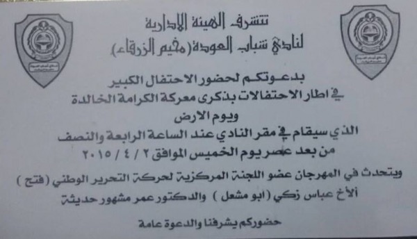 فقرات المهرجان سيتخللها كلمة لعضو اللجنة المركزية لحركة فتح عباس زكي وكلمة للدكتور عمر نجل القائد العسكري مشهور حديثة الخريشا كما وسيقوم رئيس النادي المهندس محمد المجدلاوي بالقاء كلمة ترحيبية بالضيوف وسيكون كورال الفتيان الايتام حضور اعد له اعداد يليق بحجم المناسبتين