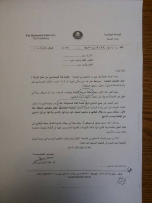 بعد ثبوت تورط رئيس الجامعه الهاشمية, الدكتور كمال بني هاني, بمجموعة من التجاوزات المالية والادارية في الجامعة الهاشمية, قام رئيس الجامعة الهاشمية -حسب التعميم المرفق- بإستهداف فئة عمال الزراعة وعمال الخدمات المكتبية وكل من يتوسط منهم لتغيير مسماه الوظيفي وذلك من خلال وضعه تحت التحقيق والمساءلة القانونية . وذلك رغم ان هذه الفئة هي فئات تحصل على اقل الحقوق وادنى الرواتب ولا يكلف تحويل بعضهم الجامعة شيئا. بينما تثبت الوثيقة المرفقة معها تورط الرئيس ومجلس العمداء في قضية فساد لفائدة قريب الرئيس.