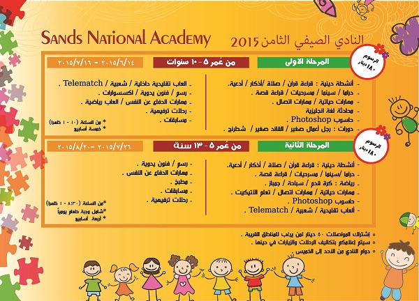 تعلن روضة و مدارس اكاديمية ساندس الوطنية عن بدء التسجيل في النادي الصيفي الثامن 2015 "