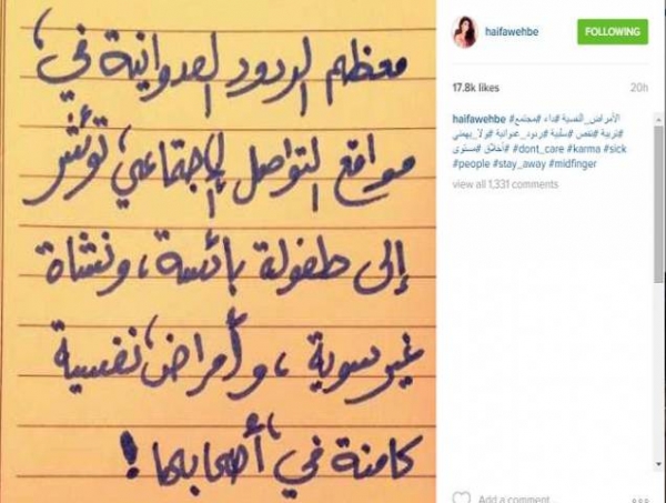 واشارت هيفاء الى عدم اهتمامها بما يقوله المتابعون من تعليقات سلبيّة، مؤكدة أنهم يعانون من نقص في التربية والأخلاق. وفي تغريدة أخرى، شدّدت هيفاء على تمتّعها بثقة كبيرة، الأمر الذي يشعرها بالسعادة والمرح.