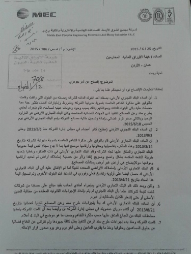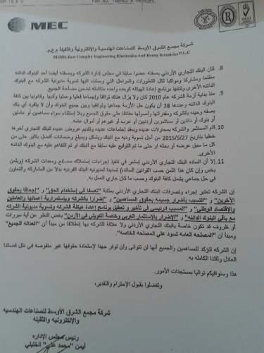 وبحسب افصاح للشركة اوضح ايمن الخليلي رئيس مجلس الادارة ان البنك حصل على امتيازات كبيرة تفوق البنوك الاخرى في بنود مذكرة التفاهم الخاصة بمديونية الشركة، وقام باستملاك الاراضي المحددة تنفيذا لما تم الاتفاق عليه وحصل على اولوية وتطبيق فعلي وفوري في التسديد قبل البنوك الا ان البنك التجاري قام باجراء احادي الجانب يقيد مبالغ على حساب الشركة من شركات كانت تابعة وبدأ باجراءات طرح سند رهن المصانع للتنفيذ قضائيا ولا يزال مستمرا في تنفيذ اجراءات الاستملاك وبثمن قليل جدا.