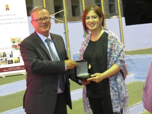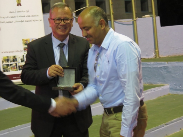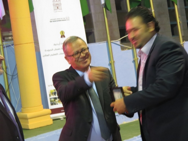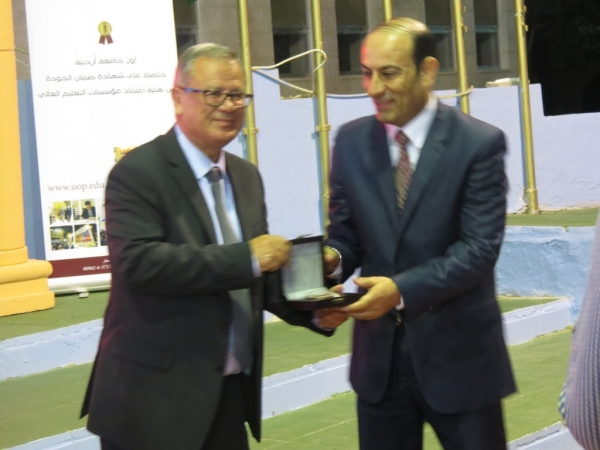 وفي نهاية الاحتفالية الذي تخللها حفل عشاء للمدعوين قام رئيس الجامعة بتسليم الدروع والميداليات على مستحقيها من أعضاء لجان العمل والمنسقين في برامج العمل والمعايير.