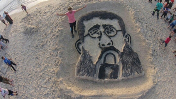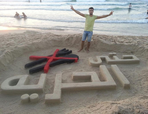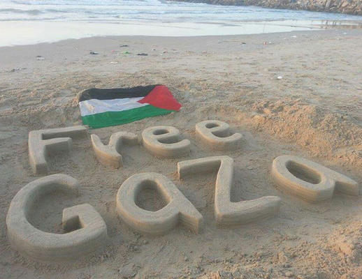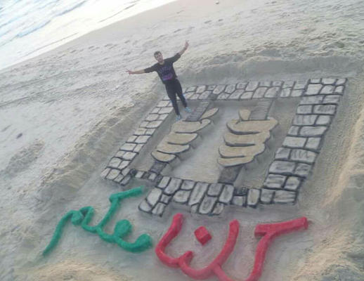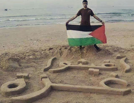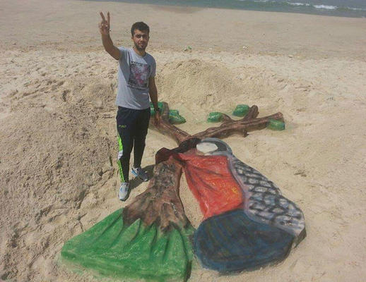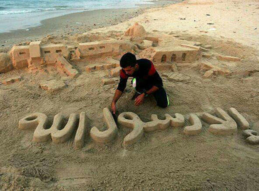 أسامة سبيته الفنان الشاب يخضّب يديه يوميا في رمال شواطئ غزة ليرسم حكاية وقصة وطن، وقصة الأسرى وتضامنه من هذه الارض لكل العالم؛ محاولا بث الصورة الحقيقية للقضية الفلسطينية.
