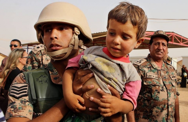 صورة إختارتها اليوم "هوفينغتون بوست"كإحدى أفضل الصور لهذا اليوم 11/9/2015 وتظهر جندي أردني يحمل طفل سوري لدى وصوله الحدود الأردنية .