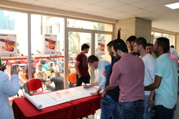 وقع المئات من طلبة و أسرة جامعة الشرق الأوسط اليوم وثيقة شرف بعنوان "لا تقتلني بفرحك" للحد من ظاهرة إطلاق العيارات النارية في الأفراح والمناسبات و التبليغ الفوري عن الفاعل .