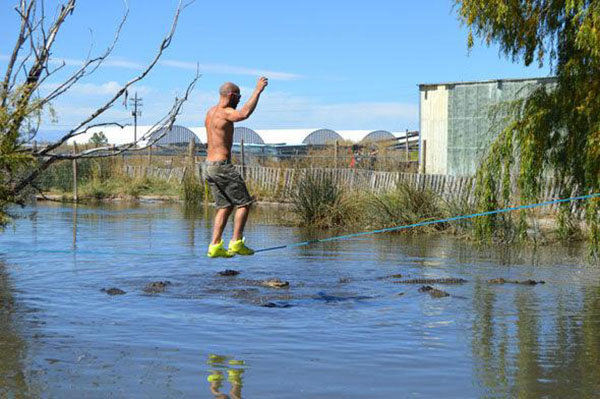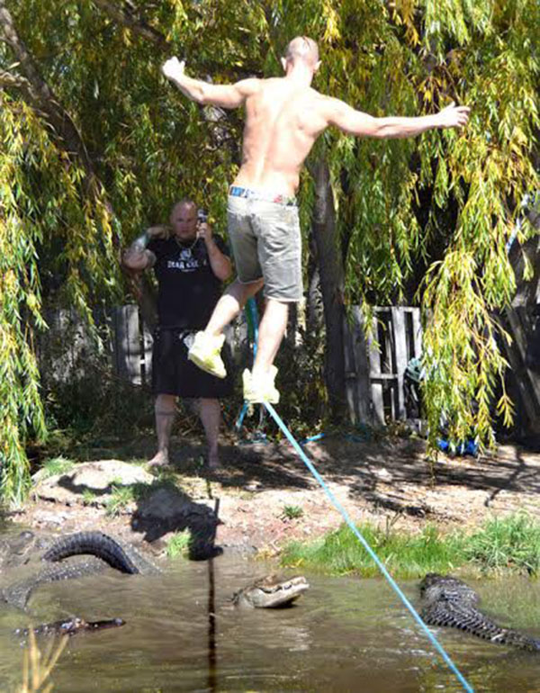لم يجد الأمريكي "جوش بودوين” (33 عاماً)، محترف السير على الحبال، أيَّ مشكلة في تصوير مغامرته المروعة التي قام فيها بالسير على الحبال فوق نهر يعج بالتماسيح الجائعة، والقيام بحركات بهلوانية قد يعني الخطأ فيها نهاية حياته بين فك التماسيح التي تراقبه من أسفل.
