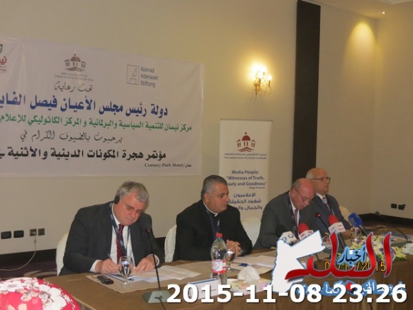 تحت رعاية رئيس مجلس الأعيان فيصل الفايز نظم المركز الكاثوليكي للدراسات والإعلام في الأردن بالتعاون مع مركز نيسان للتنمية السياسية والبرلمانية ومؤسسة كونراد اديناور Konrad-Adenauer Stiftung افتتح مؤتمراً دولياً، بعنوان "هجرة المكونات الدينية والإثنية من منطقة الشرق الأوسط "وشارك به عدد من المختصين من مختلف الدول العربية، في فندق سنتشري بارك Century Park – عمان اليوم الاثنين 9/11/2015. ويستمر المؤتمر بحسب البرنامج الى الثلاثاء 10/11.