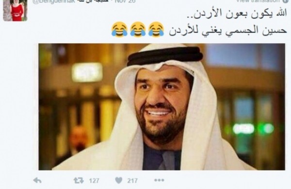 وغرّدت بن قنة: "الله يكون بعون الأردن .. حسين الجسمي يغني للأردن"، تعليقاً على تغريدة للجسمي أعلن فيها أنه سيطلق قريباً أغنية بعنوان "أردن العز".