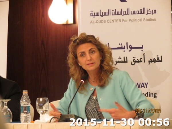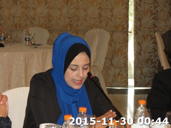 وابتدأت الجلسة بكلمة للمدير العام للجنة القدس للدراسات السياسية "عريب الرنتاوي" وقال فيها:" وضع المرأة صعب في المشاركة السياسية لان الكوتة تشكل نسبة 12% ومشاركتها بالأحزاب لا تكاد تتجاوز 9% ، وان هدفنا المطالبة برفع نسبة تمثيل المرأة بالبرلمان القادم لتصل إلى17% ".