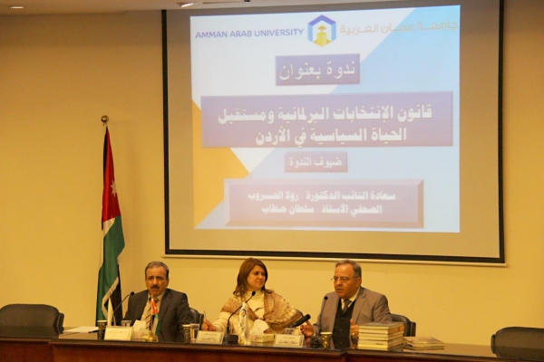 استضافت كلية القانون في جامعة عمان العربية ضمن فعالياتها الثقافية كل من سعادة النائب الدكتورة رولى الحروب و الصحفي والمؤلف الأستاذ سلطان حطاب في ندوة مميزة تناولت موضوع قانون الانتخابات البرلمانية ومستقبل الحياة السياسية في الأردن. كما ورحب عميد كلية القانون الأستاذ الدكتور أحمد ابو شنب في الضيوف الكرام وقدمهم للطلبة.