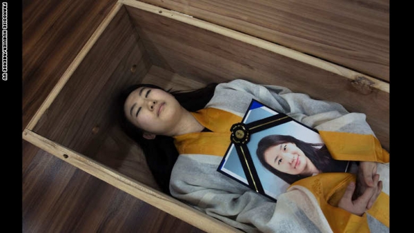 أما العلاج في مركز "هوايون" للشفاء، فبعيد عن الأسلوب التقليدي، إذ تجتمع مجموعات من الأشخاص الذين يعانون من حالات نفسية ومشاعر سلبية، في المركز لعيش تجربة الموت، وحضور "مراسم جنازتهم"، دون الاعتماد على أي علاج إضافي.