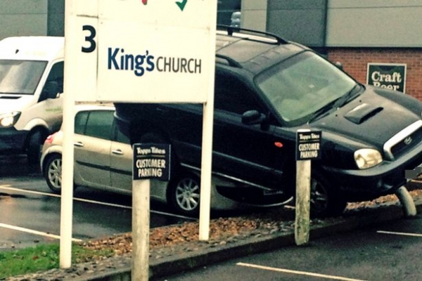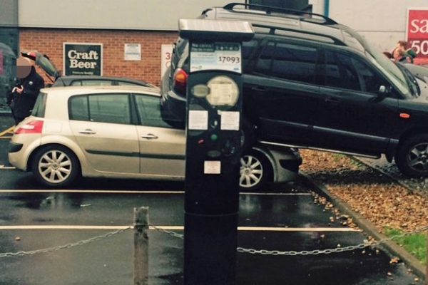 في صورة أثارت دهشة الجميع قامت إحدى المتسوقات بركن سيارتها فوق سيارة أخرى في مراكز تجاري في بريطانيا عن طريق الخطأ.