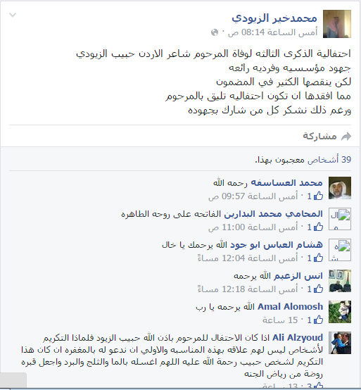 وقال شقيقة "محمد خير الزيودي" في التغيردة الاولى على مواقع التواصل الاجتماعي :" بصفتي اكبر اشقاء المرحوم الشاعر حبيب الزيودي ومن عشت معه من مولده الى مماته.. احتفالية بلدية الهاشميه في الذكرى الثالثه لوفاته لا تمثلنا..احتفاليه تسلقيه لاشخاص ولا تمثل تكريما للمرحوم."
