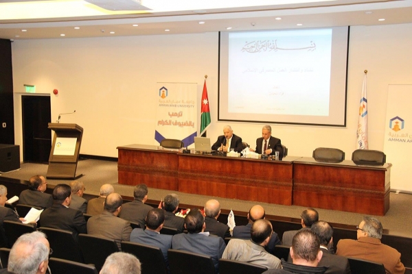 أقامت كلية الأعمال بجامعة عمان العربية ندوة حول " فلسفة المصارف الإسلامية " حاضر فيها سعادة الدكتور فؤاد محيسن , الرئيس التنفيذي لشركة الإسراء للاستثمارات والتمويل الإسلامي وحضرها عطوفة أ.د.عمر الجراح رئيس الجامعة وحشد كبير من أعضاء الهيئة التدريسية والطلبة.
