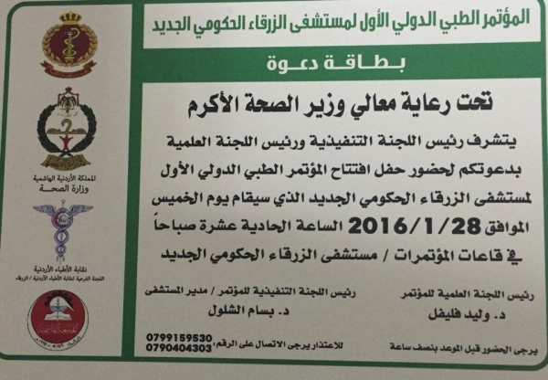 في اطار المهام والفعاليات الطبية التي يشهدها مستشفى الزرقاء الحكومي الجديد في خطته للعام الحالي، سيتم عقد المؤتمر الطبي الدولي الاول لمستشفى الزرقاء الحكومي الجديد والذي سيقام يوم الخميس في 28 من الشهر الجاري عند الساعة الحادية عشرة صباحا في قاعات المؤتمرات في المستشفى.