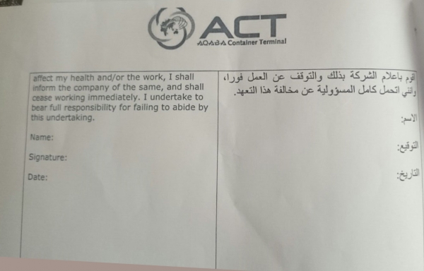واوضح ايوب ان كتاب التعهد يضم حوالي 65 بندا ظالما يحمل الموظف المسؤولية الجسدية والمادية وان هذا التعهد غير قانوني مشيرا ان المتضررين قدموا شكوى الى وزارة العمل رغم علمهم المسبق بموقف الوزارة من قضايا مشابهة كانت متحيزة فيها لرأس المال ولم تنصف العمال ولم تقف الى جانبهم.