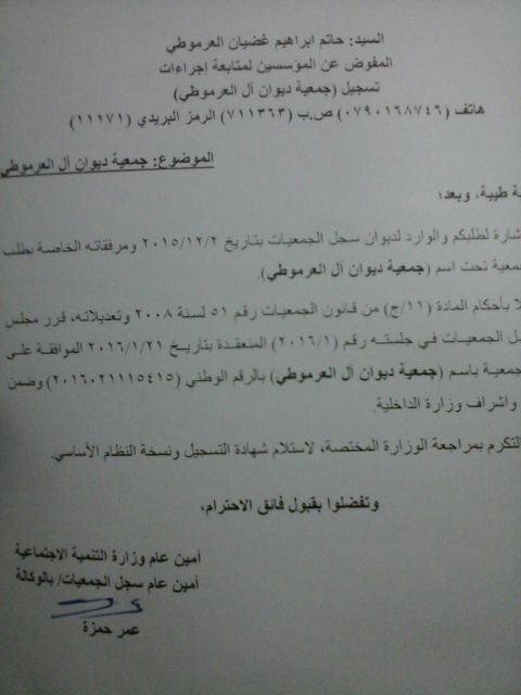 حصلت جمعية ديوان آل العرموطي على ترخيصها الرسمي مؤخرا، والصادر عن وزارة التنمية الاجتماعية