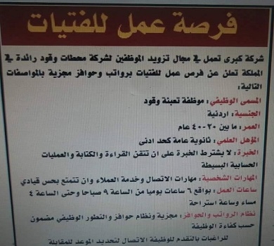 وجاء في الاعلان عن حاجة الشركة لموظفات تعبئة وقود على ان تكون الجنسية اردنية والعمر ما بين 20 الى 40 عاما اضافة لشهادة الثانوية العامة.