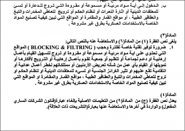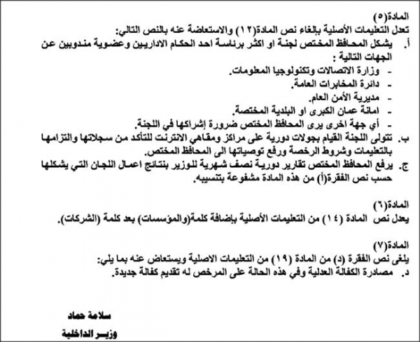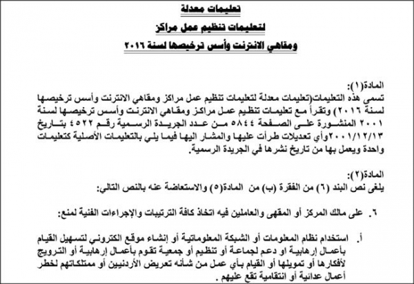قررت الحكومة التشديد على مراكز ومقاهي الانترنت من خلال تعديل التعليمات الخاصة بترخيصها. ونصّت التعليمات الجديدة المعدلة على الزامية أن تتخذ هذه المراكز والمقاهي الاجراءات الفنية لمنع استخدام نظام المعلومات او الشبكة المعلوماتية أو انشاء موقع الكتروني لتسهيل القيام بأعمال ارهابية أو دعم لجماعة أو تنظيم أو جمعية تقوم بأعمال ارهابية أو الترويج لأفكارها أو تمويلها أو اي عمل تقوم به من شأنه تعريض الأردنيين أو ممتلكاتهم لخطر اعمال عدائبة او انتقامية. كما الزمت التعليمات ضرورة أن تمنع هذه المراكز والمقاهي الدخول إلى اي مواد مرئية أو مسموعة أو مقروءة تروج للدعارة أو تسيء للمعتقدات الدينية أو اثارة النعرات او التعرض لنظام الحكم أو ترويج المخدرات والتبغ والعقاقير الطبية أو مواقع القمار أو المواقع التي تبين كيفية تصنيع المواد الخاصة بالاستخدامات العسكرية بطرق غير مشروعة. وتاليا نص هذه التعليمات