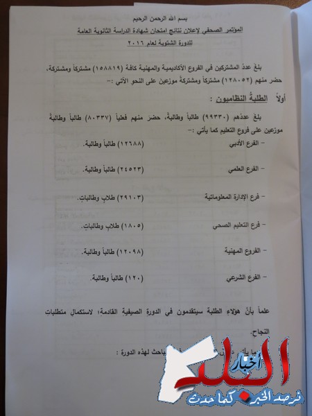عقد معالي وزير التربية والتعليم الدكتور محمد الذنيبات مؤتمرا صحفيا لاعلان نتائج شهادة الدراسة الثانوية العامة لعام 2016 / الدورة الشتوية استعرض فيها عدد المشاركين في هذه الدورة ونسب الناجحين في المباحث لكل دورة .