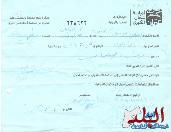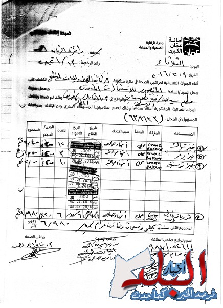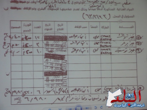 -وبعد ان وجد موظف الرقابة المواد المذكورة اعلاه قام بتحرير ضبط اتلاف باسم مطعم سياحي فئة مطعم والموثق بتاريخ 9/2/2016 وحرّر ايضا مذكرة تبليغ مختصة بالمشتكى عليه صادرة عن محكمة امانة عمان الكبرى الموقره عيًن فيها موعد تاريخ الجلسة يوم 9/3/2016 لدفع قيمة المخالفة المالية في محكمة امانة عمان الكبرى الموقره ، كما طلب موظف الرقابة من ادارة المطعم باتلاف المواد المذكوره اعلاه وقامت ادارة المطعم على الفور باتلافها وامام موظف قسم الرقابه .