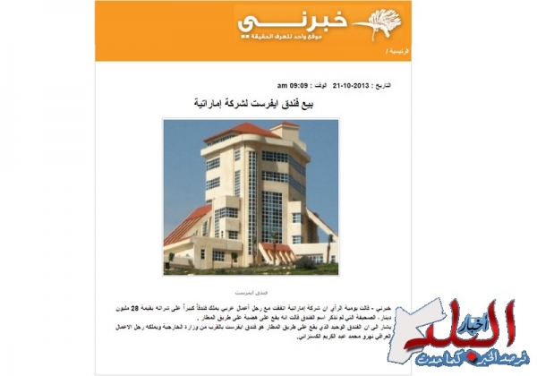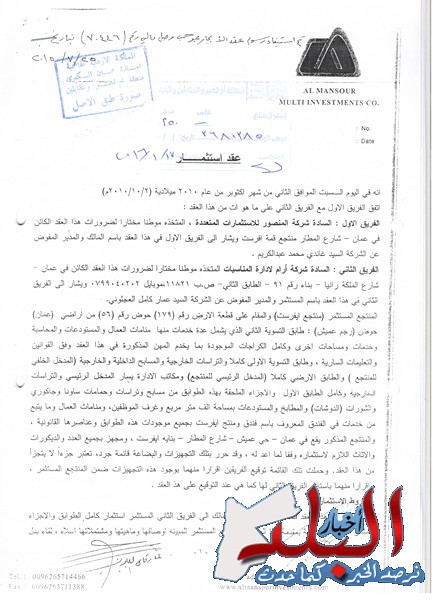 -نحن شركة افرست لادارة الاجنحة الفندقيه قمنا باستثمار مساحة 10 آلاف متر مربع تقريبا من مبنى فندق ومنتجع افرست والمملوك لشركة المنصور للاستثمارات المتعددة ومالكها عراقي الجنسية بموجب عقد استثمار مبرم بين الطرفين لمدة 10 سنوات بتاريخ 2/10/2010 ومصدق من امانة عمان الكبرى ومدفوع الرسوم حسب الاصول بالاضافة الى جميع التراخيص الخاصة بالمبنى .