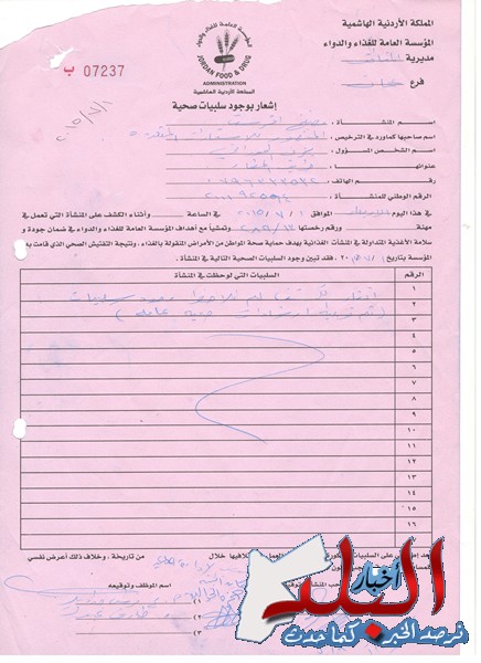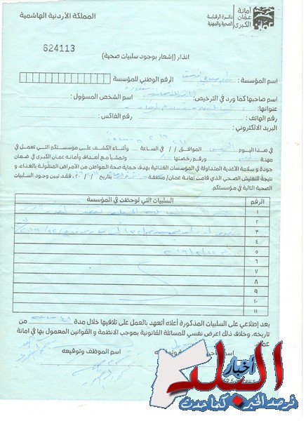 -وفي يوم الخميس الموافق 11/2/2016 في تمام الساعة الثانية ظهرا تقريبا حضر فريق تفتيش من امانة عمان منطقة المقابلين مؤلف من شخصين احدهم من قسم الرقابة الصحية والاخر من قسم المهن وقاموا بالتفتيش الدقيق ولم يجدوا اي مخالفات نهائيا ، وفي نفس اليوم مساءً حضر فريق من الرقابة الصحيه من امانة عمان الكبرى الرئيسية الموقره وحرر انذار ( اشعار بوجود سلبيات صحيه ) باسم المؤسسة مطعم سياحي افرست ولم يشرح به عن اي سلبيات وامهل المطعم مهلة 48 ساعة لتلافي تلك السلبيات .