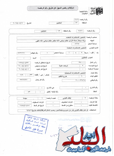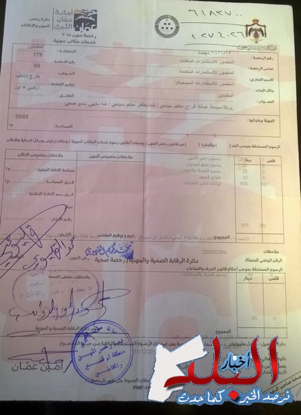 -بتاريخ 3/2/2016 حضر مهندسوا امانة عمان منطقة المقابلين للمبنى وابدوا ملاحظتين بسيطتين وطلبوا تصويب تلك الملاحظات ، وفي اليوم التالي مباشره بتاريخ 4/2/2016 حضر المهندس ينال زمنون من طرفنا لامانة عمان منطقة المقابلين للاستيضاح عن الملاحظات وتصويبها فورا وطلبوا تزويدهم بمخطط تعديلي يثبت به وجود شادر قماش متحرك على احدى ترسات المبنى ، وتم تزويد منطقة المقابلين بذلك المخطط التعديلي الذي يثبت وجود شادر قماشي وذلك يوم السبت بتاريخ 13/2/2016 وهو نفس اليوم الذي تم به اغلاق المبنى كاملا وذلك تسبب في تاخرنا من تنفيذ اجراءات التراخيص .