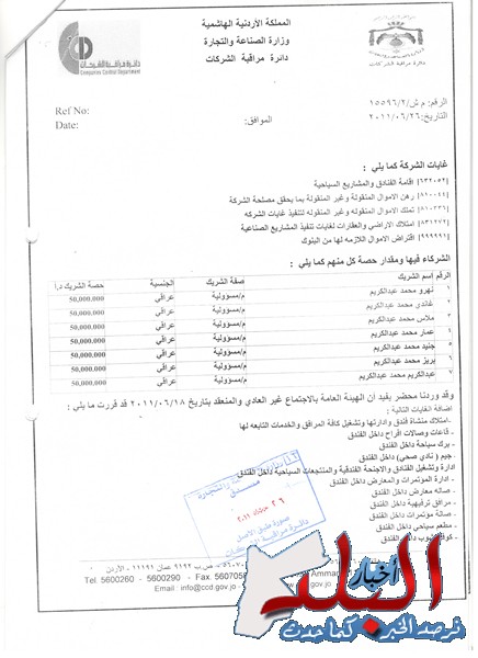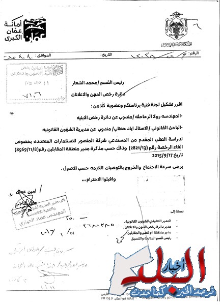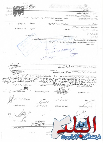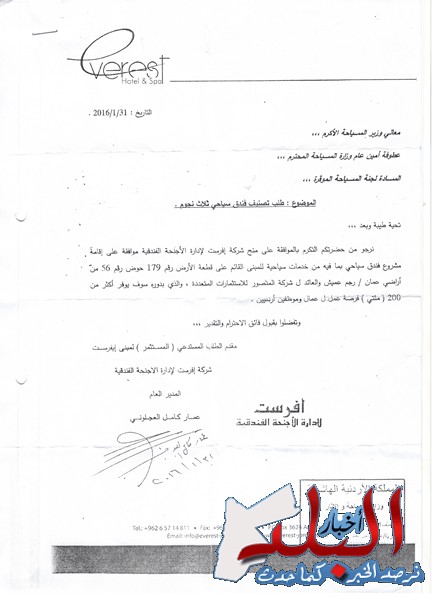 -وبتاريخ 31/1 /2016 تم تقديم طلب من طرفنا لوزارة السياحة للحصول على موافقة الوزارة حسب متطلبات قرار اللجنة اللوائية الموقره رقم 40 المذكور اعلاه واجتمعت لجنة السياحة بتاريخ 11/2/2016 وتتالف من 17 عضو تقريبا ومن بينهم مدير التخطيط بامانة عمان الكبرى السيد عماد الحياري المحترم وقد كان رايه غير داعم لحصولنا على موافقة وزارة السياحة وذلك بسبب عدم التزام شركة المنصور للاستثمارات المتعددة مالكة المبنى بتنفيذ تعهداتها التي قدمتها سابقا للحصول على موافقة وزارة السياحة وبهذا الحال ظلمنا كمستثمريين اردنيين بسبب افعال وعدم التزام الشركة المالكة للمبنى وبناء عليه تم تحويل الطلب للمستشار القانوني لوزارة السياحة والآثار وعليه فاننا نتمنى من السيد عماد الحياري المحترم دعم طلبنا والذي يقدم لاول مرة في وزارة السياحة والاثار كشركة اردنيه مستثمره ونحن على استعداد تقديم الكفالة المالية التي تطلبها لجنة السياحة الموقره لضمان حسن تنفيذنا .