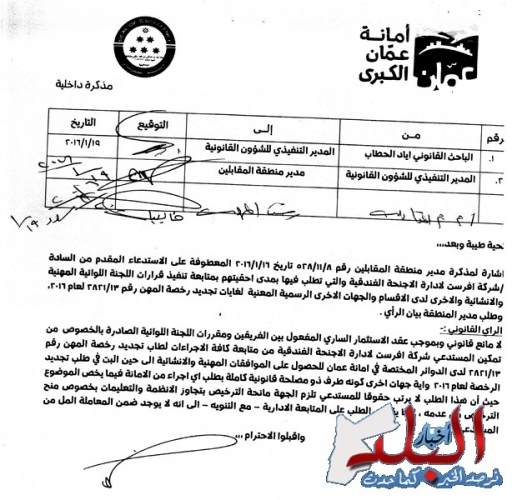 -بتاريخ 10/1/2016 ايضاً صدر قرار اللجنة اللوائية الموقره رقم 40 والذي ينص على عدم الموافقة على طلب شركة المنصور ( الشركة التي يملكها المستثمر العراقي المالكة للمبنى ) لالغاء الترخيص المهني للمبنى . ونص على تجديد الترخيص المهني للمبنى رخصة المهن رقم 13/2821 لعام 2016 بعد الحصول على اذن اشغال لكامل البناء والحصول على موافقة الدفاع المدني وموافقة وزارة السياحة ، وخلافا لذلك يتم اتخاذ الاجراءات القانونية المنصوص عليها لالزام صاحب العلاقة بتصويب الاوضاع ، حيث ان طلب اللجنة اللوائية لاذن الاشغال لكامل البناء هو طلب يصعب تنفيذه حيث اننا اوضحنا لمعالي امين عمان الاكرم وبصفته رئيس اللجنة اللوائية الموقره ان الطوابق العلوية للبناء تابعه للشركة التي يملكها المستثمر العراقي مالكة البناء وليست تحت تصرف الشركة الاردنيه المستثمرة حتى تتمكن من تشطيب تلك الطوابق والحصول على اذن اشغال لكامل البناء وذلك على خلاف جميع اذون الاشغال السابقة الصادرة للمبنى حيث انها كانت جميعها تخص الطوابق المستثمره فقط ( اذون اشغال جزئيه ) . وبناء على قرار اللجنة اللوائية الموقره رقم 40 والصادر بتاريخ 10/1/2016 قمنا بمراجعة امانة عمان منطقة المقابلين التي نتبع لها بتاريخ 16/1/2016 وهو تاريخ وصول البريد من الامانة الرئيسية لمنطقة المقابلين ، للبدء بتنفيذ وتوفير متطلبات قرار اللجنة اللوائية الموقره رقم 40 ، وعليه قامت امانة منطقة المقابلين بتحويل طلبنا لتجديد رخصة المهن لعام 2016 الى قسم الشؤون القانونية بامانة عمان الرئيسية لبيان الراي القانوني في احقيتنا كشركة افرست لادارة الاجنحة الفندقية (المستثمر الاردني ) بمتابعة تنفيذ قرارات اللجنة اللوائية الموقره ، المهنية والانشائية والاخرى لدى الاقسام والجهات الرسمية المعنية و بتاريخ 23/1/2016 تم تزويدنا بالرأي القانوني المطلوب للامانة في منطقة المقابلين والذي افاد باحقيتنا بذلك ، وبنفس هذا اليوم قمنا بتقديم طلب تجديد اذن الاشغال لتجديد الترخيص المهني لدى امانة عمان منطقة المقابلين وعليه فقد تم تحديد تاريخ يوم 3/2/2016 من طرف القسم الهندسي بامانة المقابلين لمعاينة المبنى هندسياً .